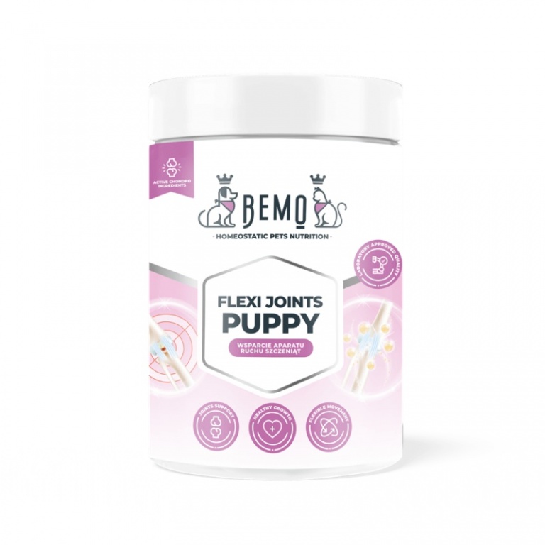 BEMO Flexi Joints Puppy ir uztura papildinājums suņu locītavu un skeleta attīstībai — paredzēts kucēniem no aptuveni 8. nedēļas dzīves līdz 9 mēnešu vecumam.