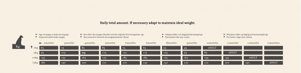 Mēs iesakām izmantot šo tabulu kā sākotnējo vadlīniju un pēc tam atbilstoši pielāgot dienas devu, uzraugot suņa svaru. Mēs iesakām barot suni divas reizes dienā.